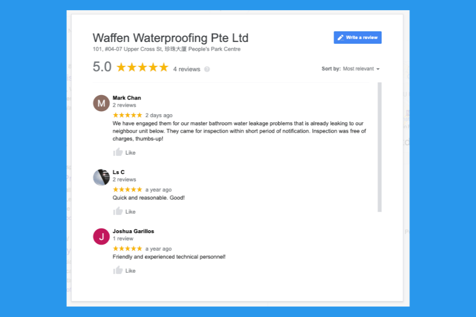 I've tried many other waterproofing contractors, plumbers, whatsoever, Waffen has great experienced staffs that finally solved my ceiling leakage issues